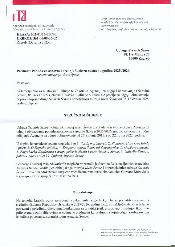 Do ponovnog otvaranja Kuće Šenoa javnosti predlažemo naše edukacijske šetnje užim centrom Grada Zagreba za koje je također proteklih godina bio veliki interes. Svi razgledi vezani su uz život i djelo Augusta Šenoe, njegovu obitelj, prijatelje i znance koji su danas naše povijesne ličnosti, te uz Zagreb iz vremena u kojem je živio August Šenoa. Sve činjenice i anegdote o kojima pričamo autorica svih scenarija Jasmina Reis pronašla je u tekstovima Augusta Šenoe i njegovog sina Milana, intervjuima žene Slave, dnevnicima, pismima, dokumentima i arhivu. Jasmina Reis je članica obitelji Šenoa već 47 godina. Njen poočim bio je Zdenko Šenoa, jedini unuk Augusta Šenoe. Jasmina Reis je voditeljica Kuće Šenoa, dopredsjednica udruge Svi naši Šenoe i počasna turistička vodičica prema odluci Ministarstva turizma.